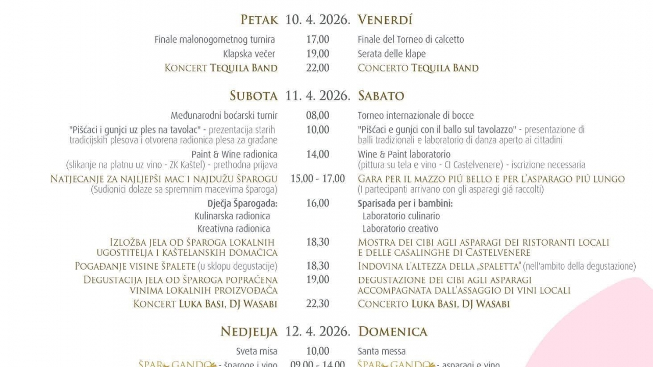 Ljubitelji domaće kuhinje, prirode i dobrog druženja i ove će godine doći na svoje – u Kaštelu se od 10. do 12. travnja održava 26. izdanje tradicionalne Šparogade. Riječ je o jednoj od najprepoznatljivijih proljetnih manifestacija u ovom dijelu Istre koja svake godine okuplja brojne posjetitelje.