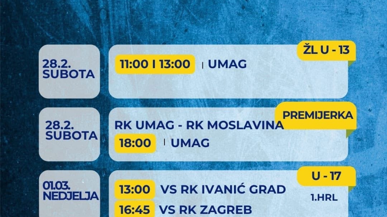U subotu, 28. veljače 2026. godine, u Sportskoj dvorani Juraj Radovčić u Umagu odigrat će se utakmica 3. kola Premijer lige – Lige za ostanak između RK Umag i RK Moslavina (Kutina).