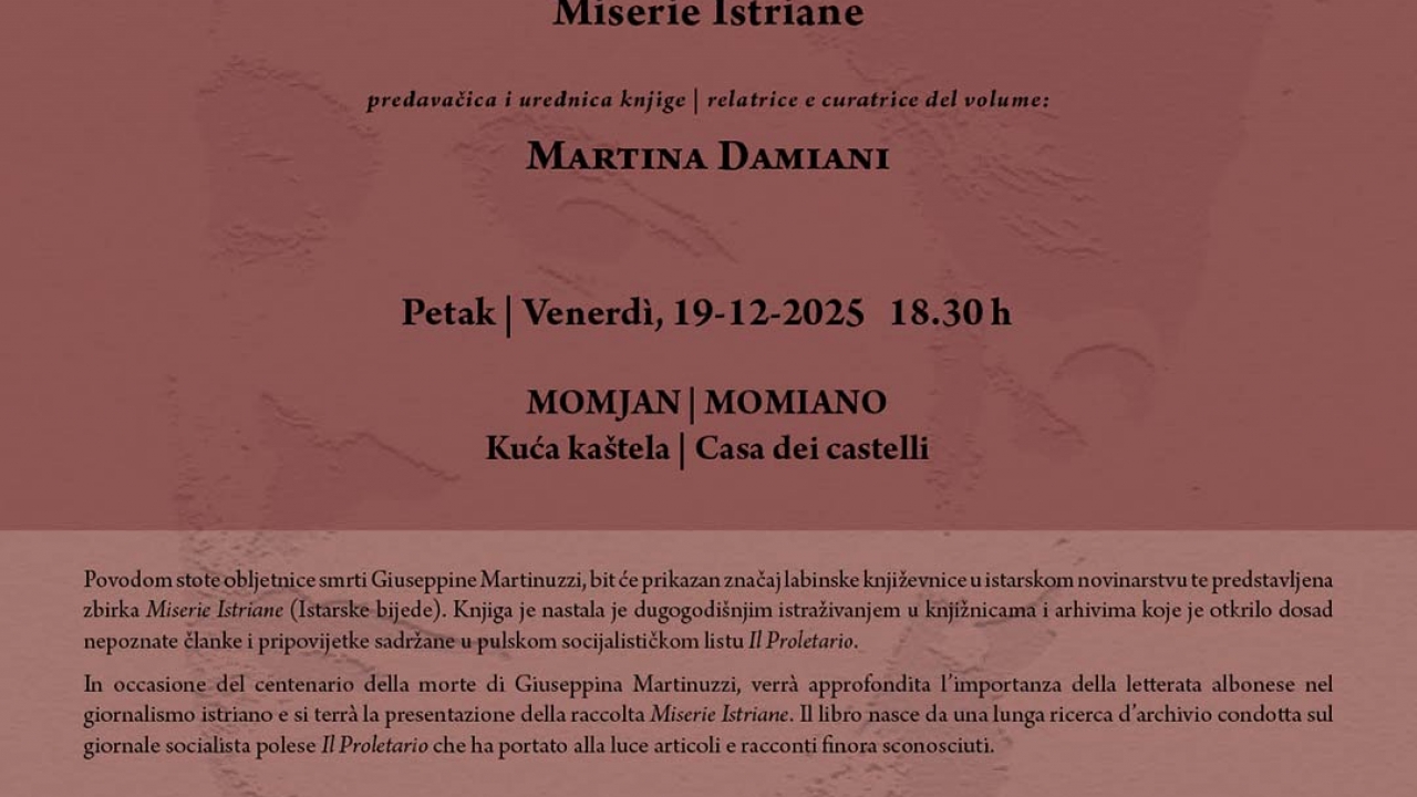 Predavanje i predstavljanje knjige održava se povodom stote obljetnice smrti Giuseppine Martinuzzi, s ciljem da se istakne njezin značaj u istarskom novinarstvu te predstavi zbirka Miserie Istriane (Istarske bijede). Knjiga je rezultat dugogodišnjeg istraživanja u knjižnicama i arhivima, tijekom kojeg su otkriveni dosad nepoznati članci i pripovijetke objavljeni u pulskom socijalističkom listu Il Proletario.