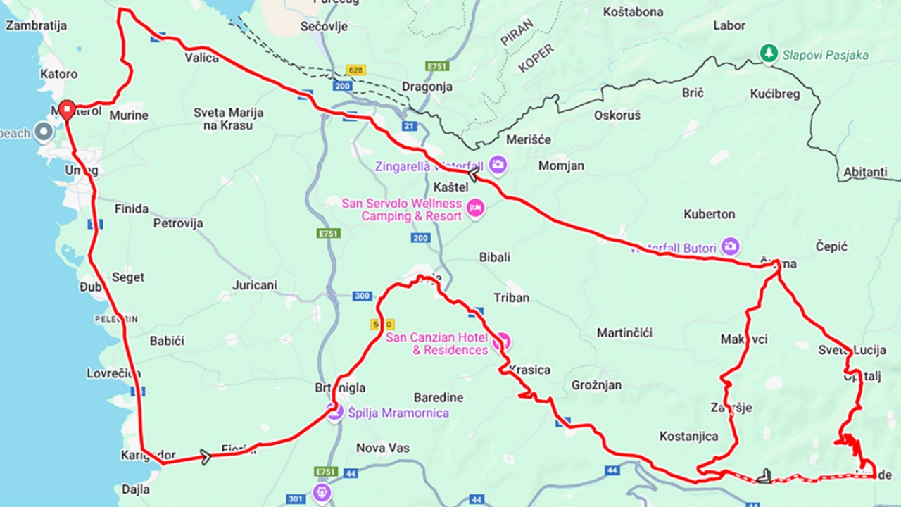Trasa Istria Medio Fondo: Umag - Karigador - Brtonigla - Buje - Bijele Zemlje - Livade - Oprtalj - Šterna - Kremenje - Kaštel - Plovanija - Umag.