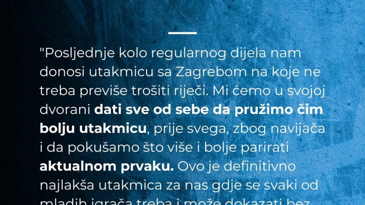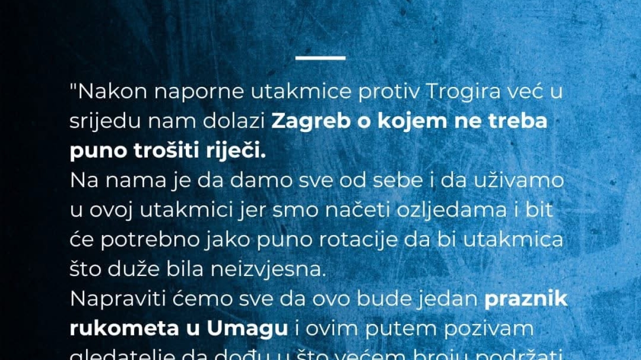 Žuto-plavi iza sebe imaju vrlo dobru povratničku sezonu u elitnom rangu, u kojoj su u prvom dijelu prvenstva sakupili 10 bodova. Klub poziva sve navijače, simpatizere i ljubitelje rukometa da ispune tribine i glasnom podrškom nagrade igrače za dosadašnji trud u ogledu protiv aktualnog prvaka Hrvatske.
