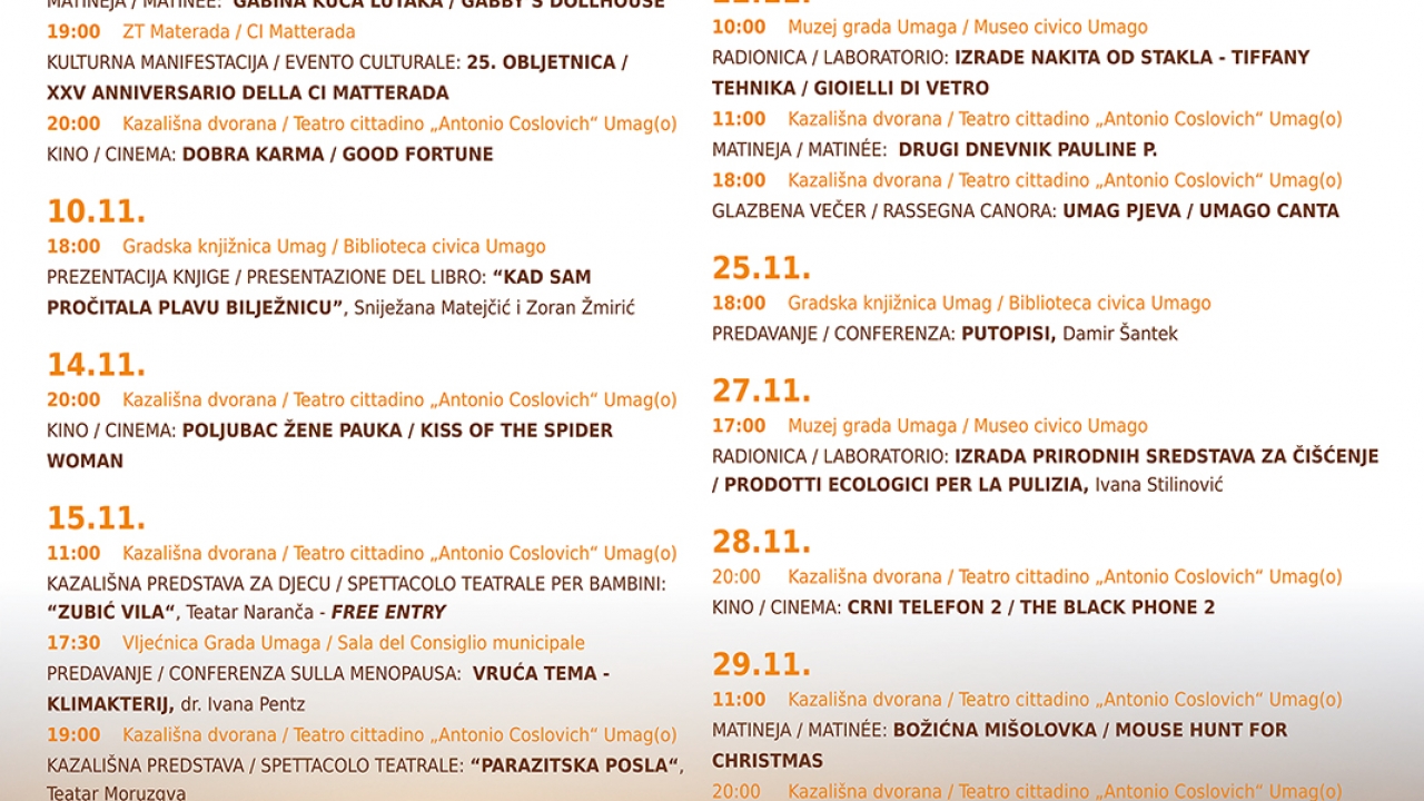 Objavljen je program događanja u Umagu ovog studenog - pogledajte koje nas sve aktivnosti, prezentacije, radionice, događaji i predstave očekuju u nadolazećem mjesecu!