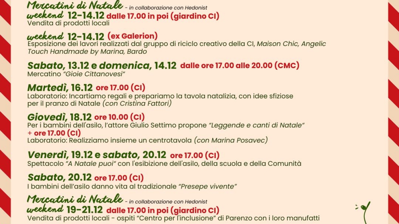 U današnjoj emisiji „Novosti iz grada Novigrada“ gošća je Cristina Fattori, predsjednica Zajednice Talijana Grada Novigrada. Razgovarali smo o programu „Avvento in comunità“ – radionicama za djecu, božićnim sajmovima, koncertima, predstavama i natječaju za najbolji novigradski med koji će tijekom prosinca ispuniti Novigrad blagdanskim ugođajem. Poslušajte i saznajte više!